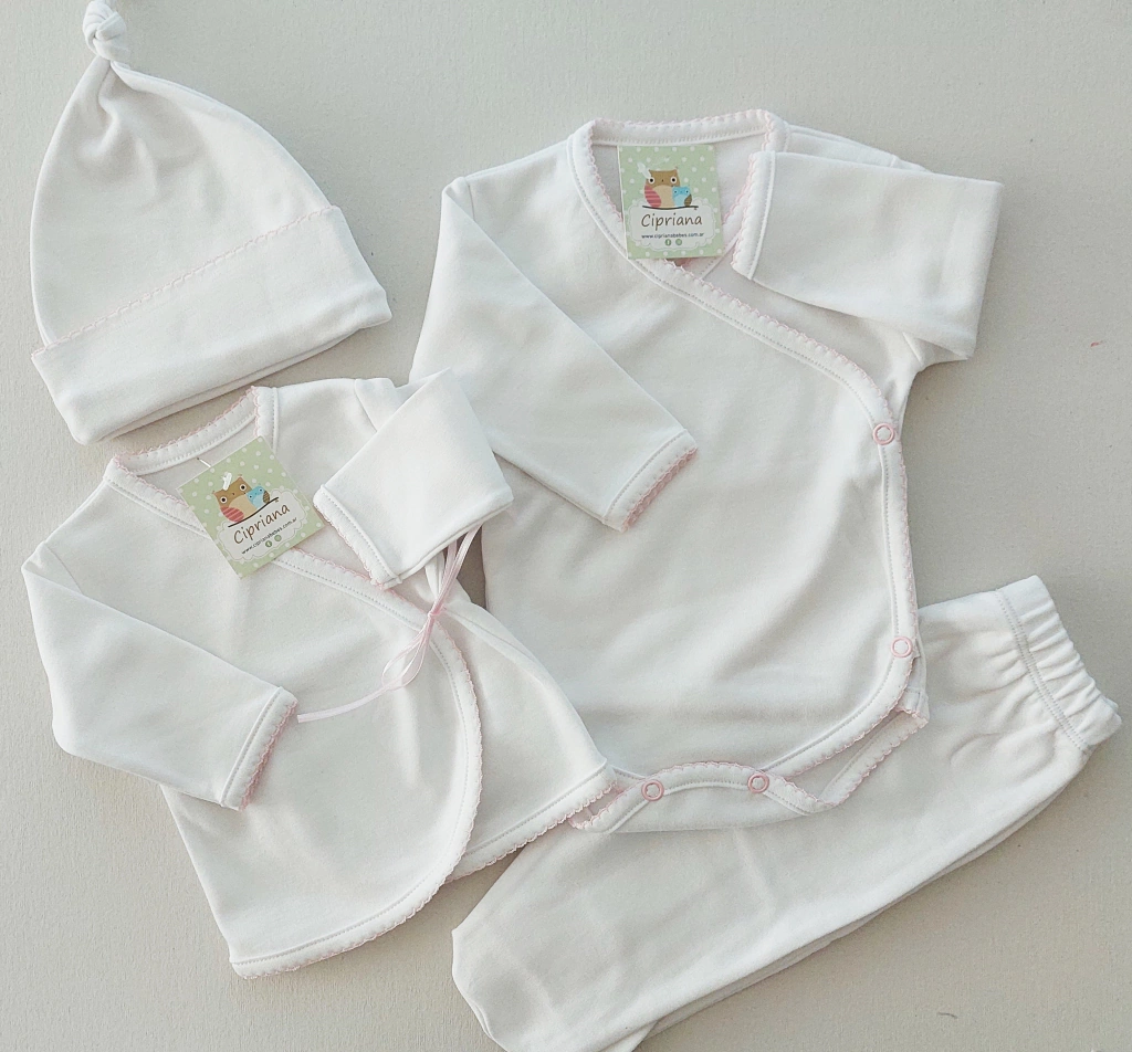 Blanco picot rosa. Batita, rana, gorro, body cruzado.